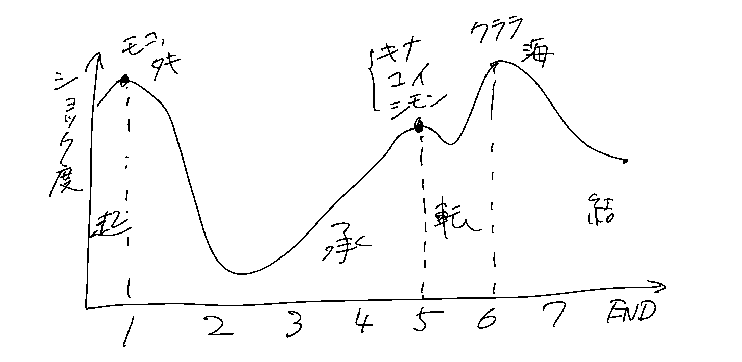 この、「システム面の残酷さを緩和する」というのはシナリオ制作における1つの課題で、色々な調整を試みることになりました。その1つが、いわゆる「承」の部分の心理的負担の軽減です。5〜6日目のつらい展開を残しつつ、プレイヤーの心が途中で折れてプレイを辞めてしまわないように、2〜4日目は比較的楽しくプレイできるようにしようと思いました。