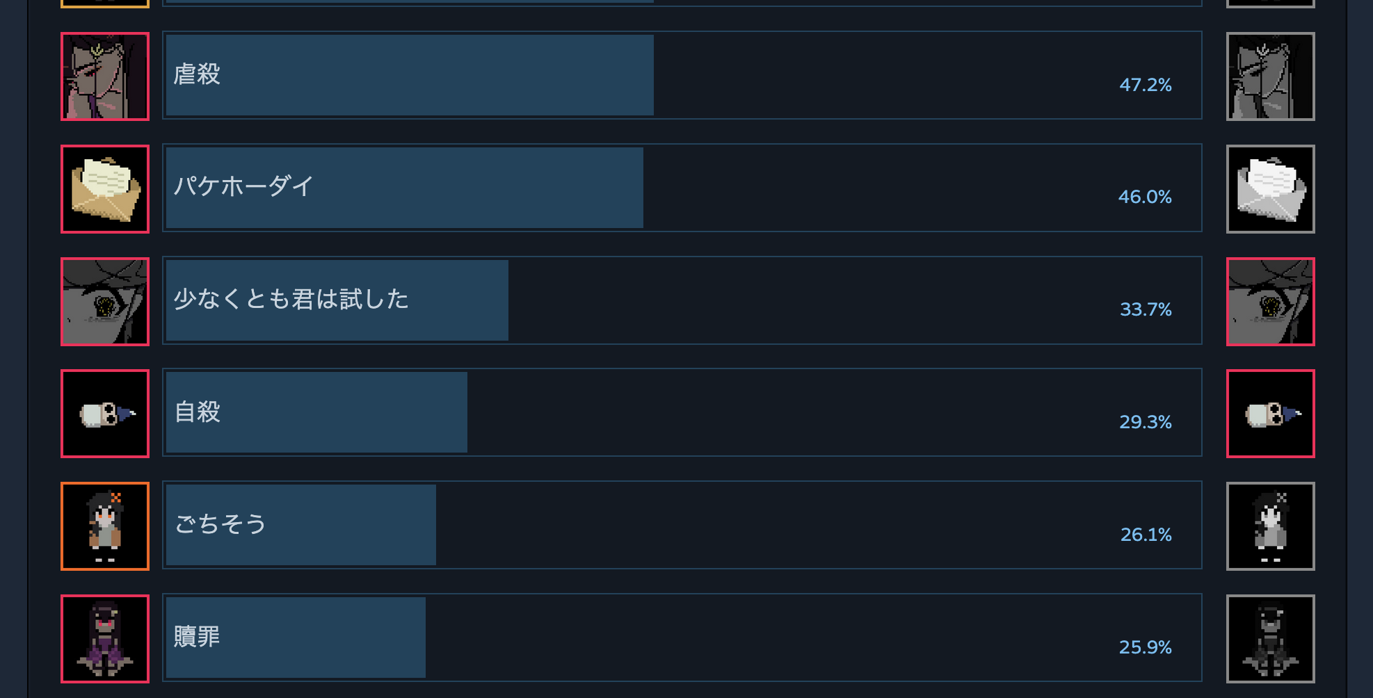 Steamの実績データを見る限り、虐殺エンドが3つのエンドの中で一番到達率が高く、これはちょっとした衝撃でした。作っている時は、むしろ一番珍しいエンドだと思っていたからです。UndertaleのGルートみたいな気持ちだった…。ただ、ルールに従ってたら虐殺エンドに入ってた、という声もよく聞くし、この辺は今後の課題というやつかもしれません。「時としてルールに逆らうことが正しいプレイになる」というの、Papers, Pleaseとかもやってて、個人的にけっこう好きなギミックではあります。